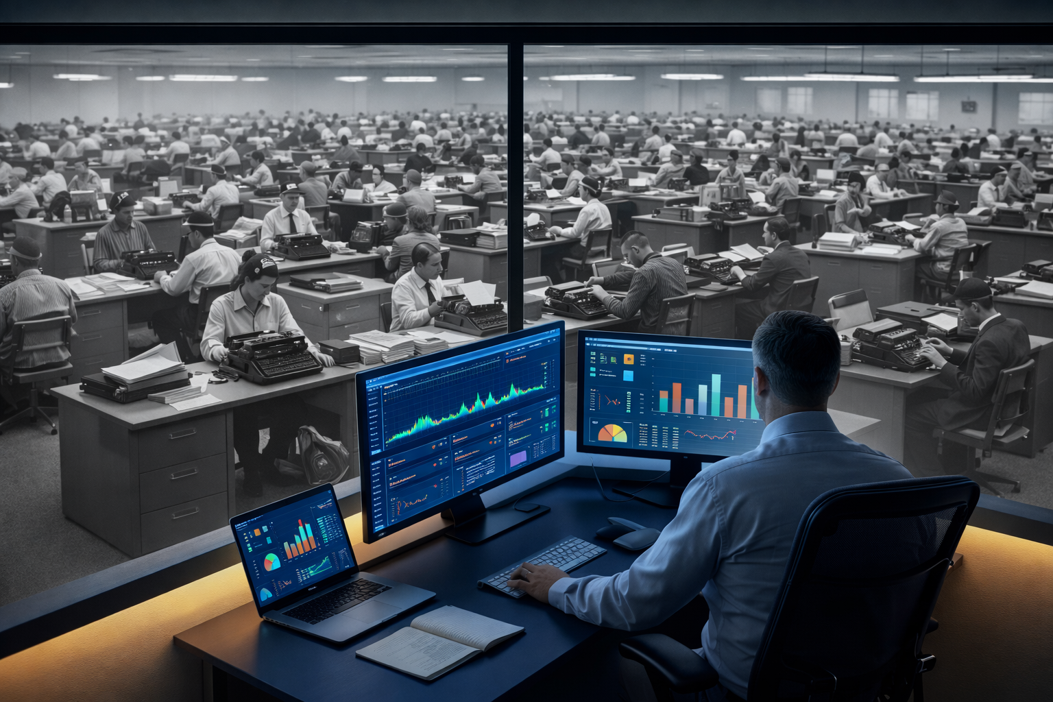 Modern office with data dashboards overlooking a black-and-white workspace of people using typewriters, showing new tools layered on old workflows